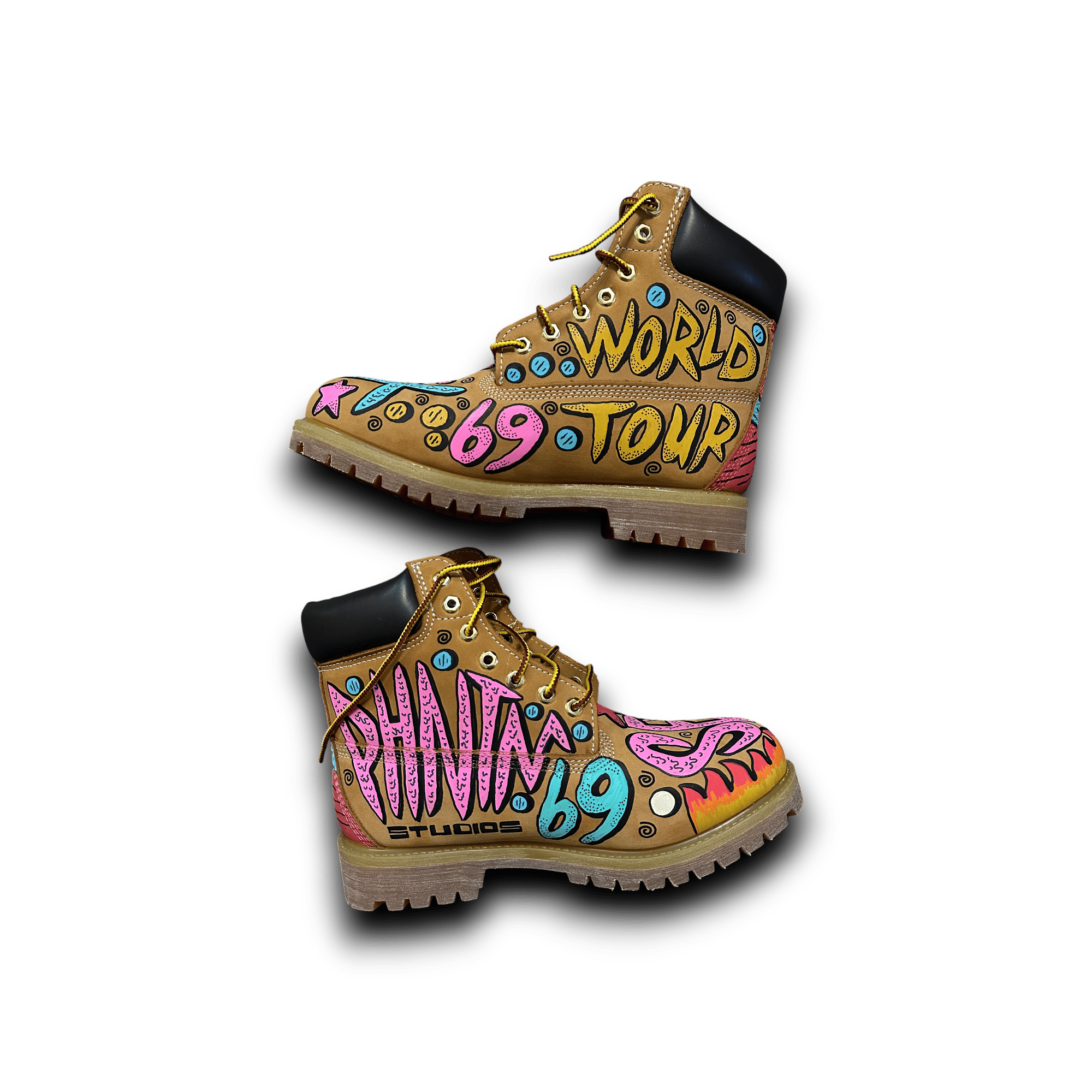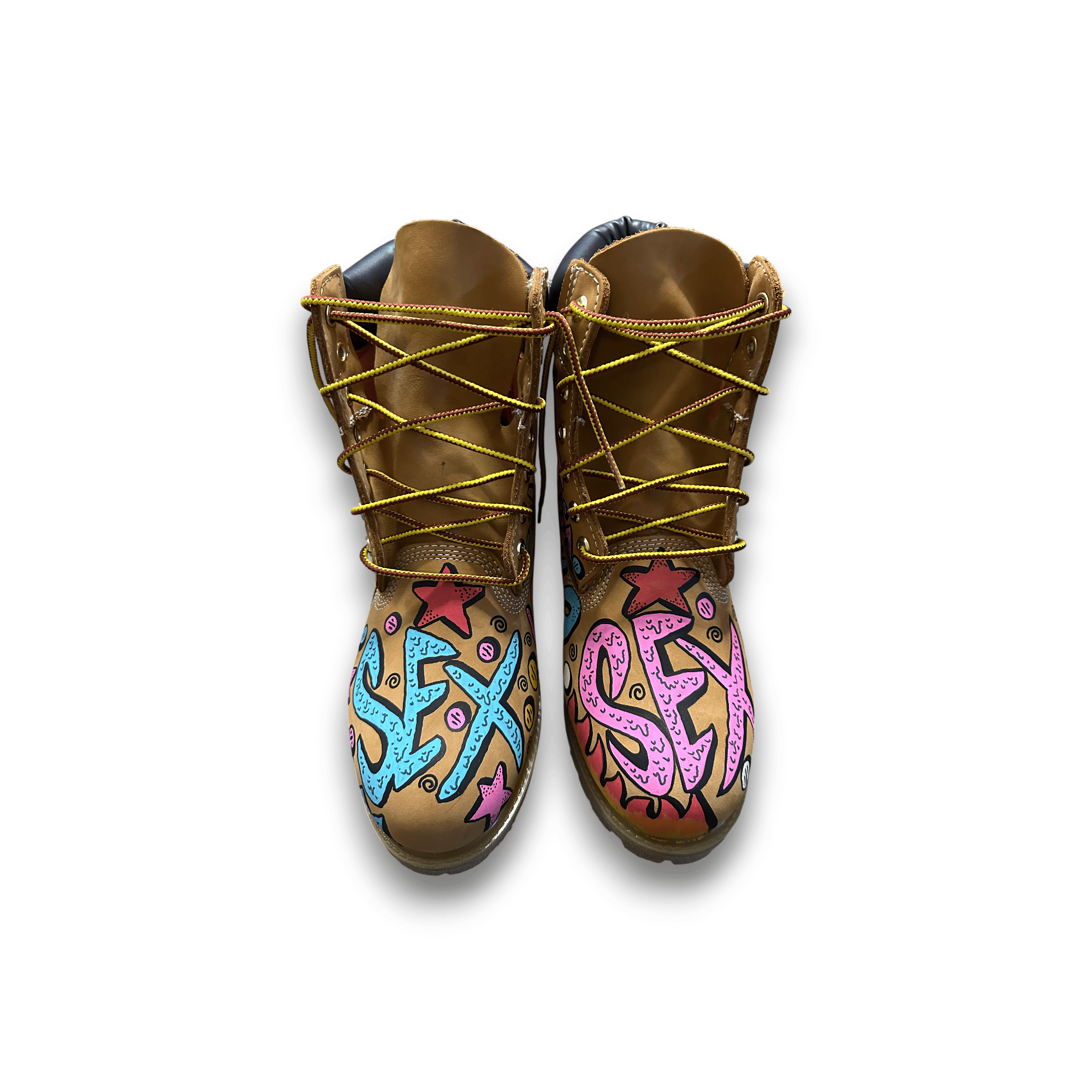Hand-Painted Timberland wheat 6- inch Boots: Custom Sex 69 Abstract art