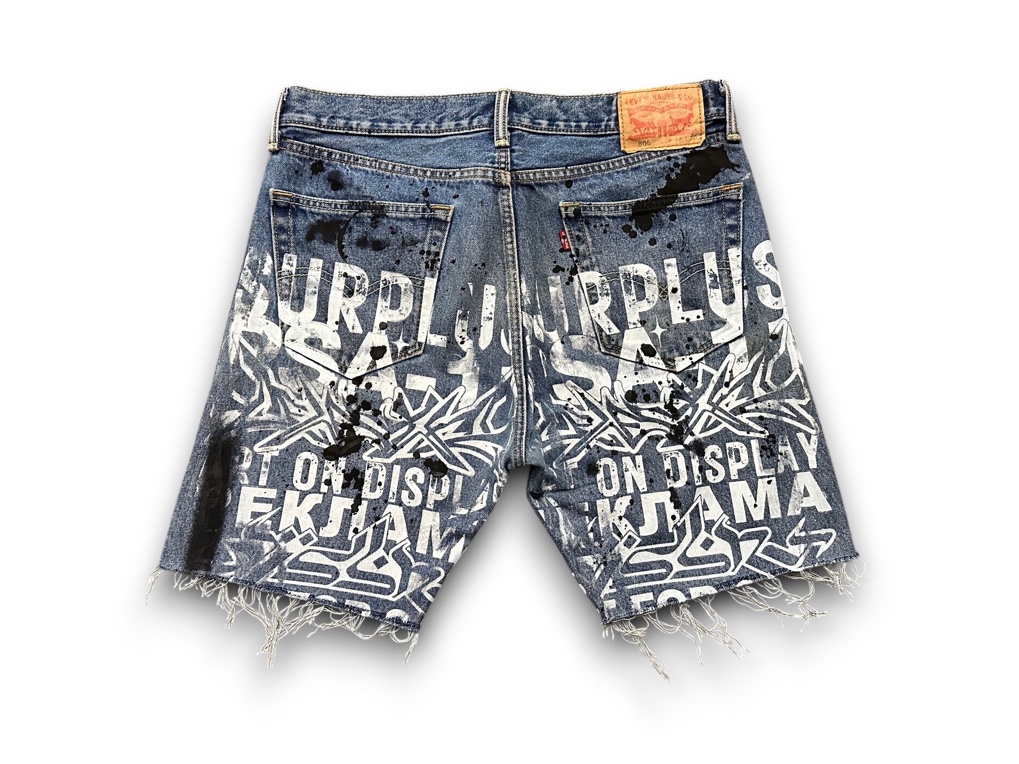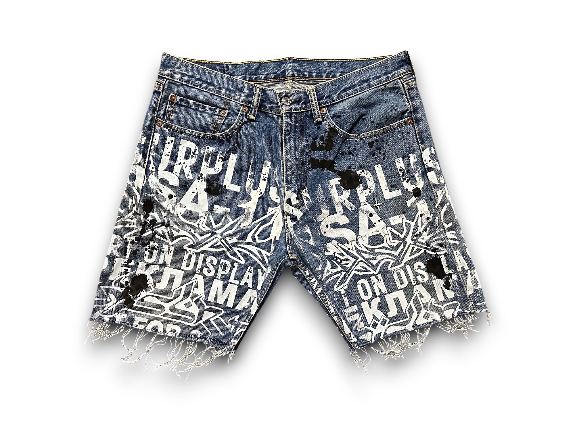 Levi's 505 Alchemy Surplus Upcycled Reworked custom Screen Print dark wash denim shorts