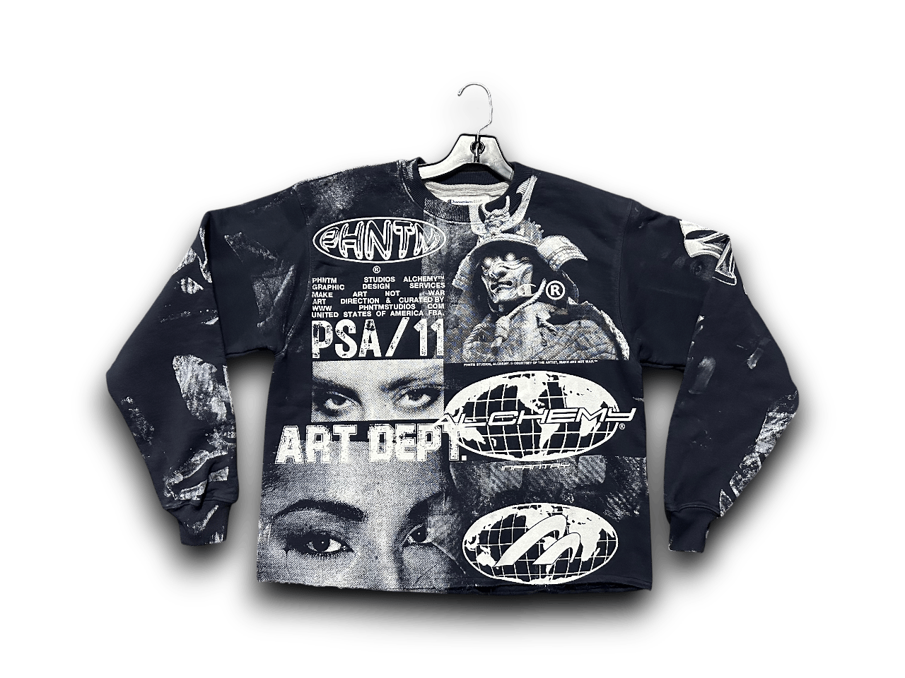 Sade Adu black samurai art dept upcycled screen print navy blue/white sweatshirt