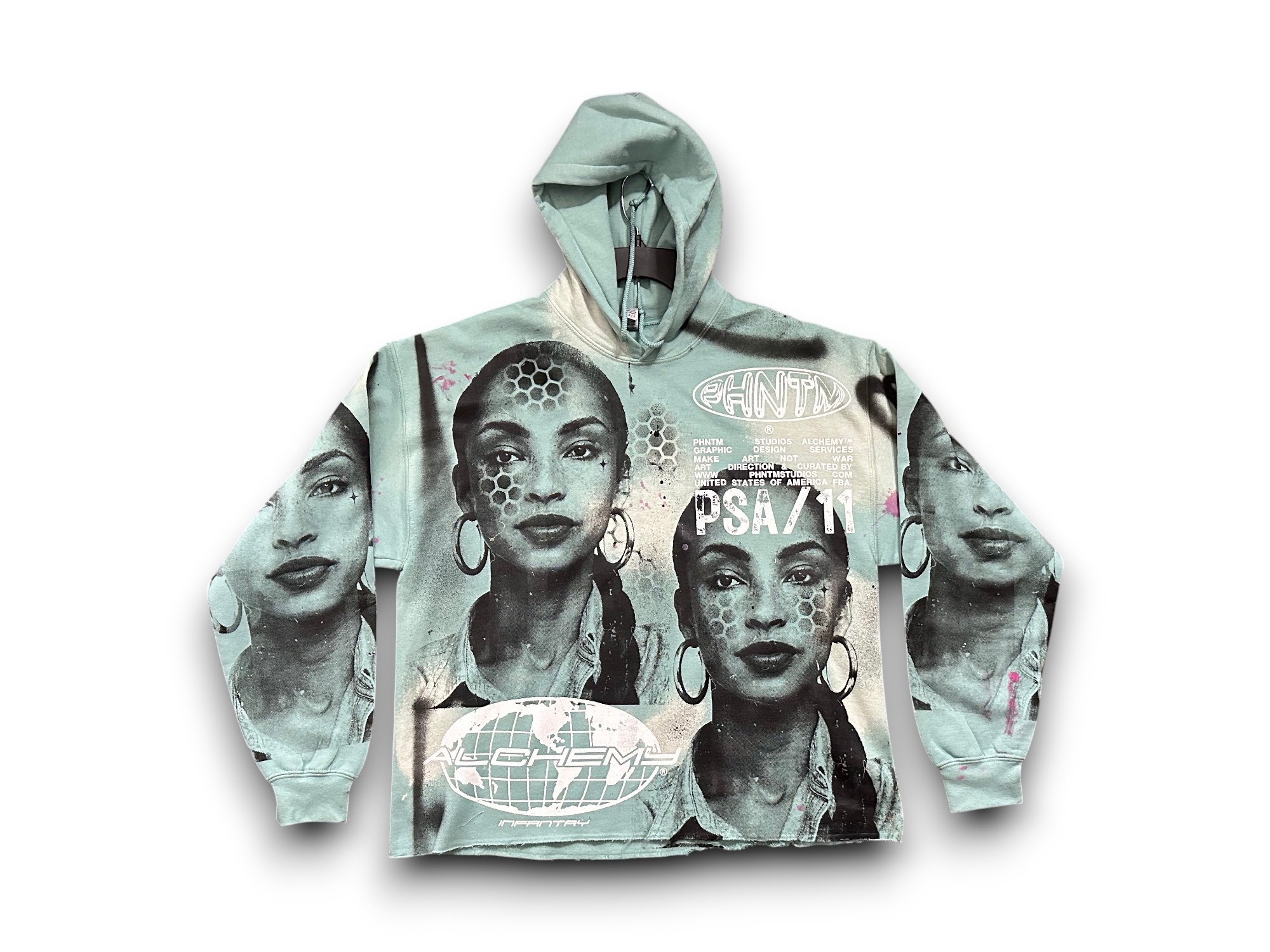 Sade Adu custom upcycled reworked Screen Print mint green bleached hoodie