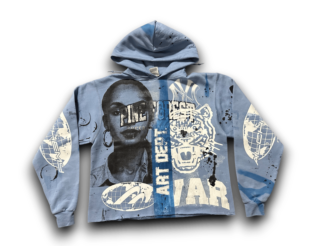 Sade black panther party NY war art dept pine forest upcycled screen print baby blue/white hoodie